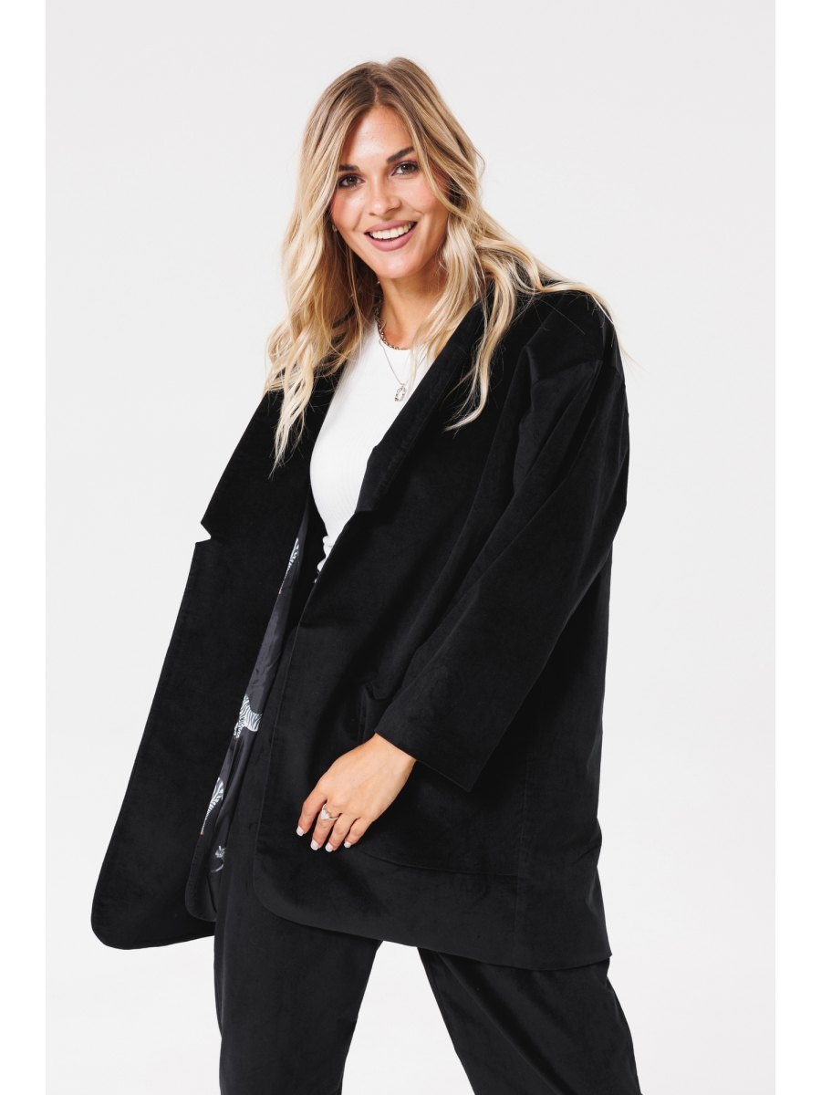 Жакет женский на подкладке из текстильной ткани (бархат), оверсайз. По переду расположены накладные карманы, спинка со средним швом. Спущенное плечо, рукав одношовный 7/8. Вырез горловины оформлен цельнокроенной стойкой.
