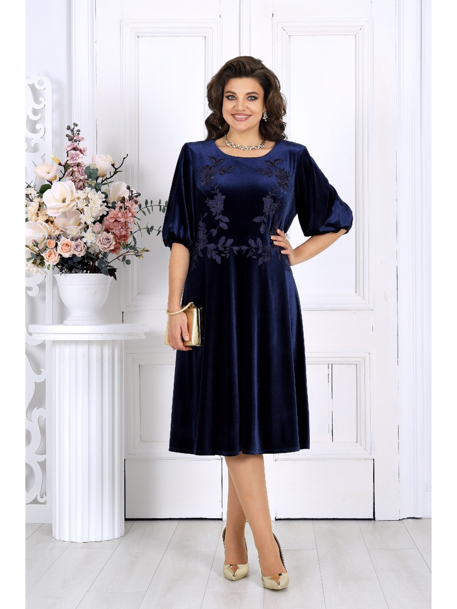 Платье женское, выполнено из трикотажного полотна «велюр». Модель на трикотажной подкладке, с плечевыми накладками и застежкой на потайную тесьму-«молнию» (50 см) в среднем шве спинки. Платье отрезное по линии талии, с лифом полуприлегающего силуэта и расширенной к низу юбкой. Лиф с нагрудными вытачками по переду и талиевыми по спинке. От горловины лифа вниз, переходя на юбку, настрочены симметричные аппликации. Рукав втачной, трехчетвертной; низ сосборен эластичной лентой. Длина платья -- 105 см; длина рукава - 39 см.