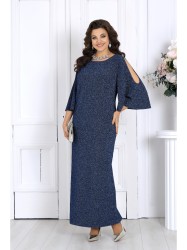Платье женское полуприлегающего силуэта, выполнено из трикотажного полотна с фактурной лицевой стороной «люрекс». Модель на трикотажной подкладке, без застежки и плечевых накладок. Перед платья с нагрудными вытачками, направленными от проймы. Спинка с талиевыми вытачками и разрезом в нижней части среднего шва. Края V-образной горловины спинки фиксируются тремя перемычками из основного материала; горловина переда круглой формы. Рукав трехчетвертной, расширенный, с вырезом «капля» от плеча. Длина платья -- 144 см; длина рукава - 49 см.