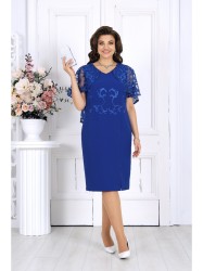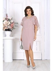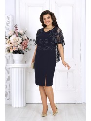 Платье женское, полуприлегающего силуэта, выполнено из костюмно-плательной ткани и гипюра. Модель на трикотажной подкладке, без рукавов и плечевых накладок. Перед отрезной по линии талии; на верхней части обработаны рельефы, направленные от пройм, на нижней – талиевая вытачка и рельефный шов с разрезом внизу. Лиф переда декорирован настрочной аппликацией. Спинка с талиевыми вытачками и средним швом, в верхней части которого обработана застежка на потайную тесьму-«молнию» (50см). Вырез горловины спинки округлый, по переду – углубленный, V-образный. В шов обтачивания горловины входит пелерина из гипюра, разъемная по середине переда и спинки; низ пелерины асимметричный, укороченный спереди. Длина платья – 104 см.