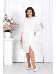 Платье женское полуприлегающего силуэта, выполнено из трикотажного полотна с фактурной лицевой стороной «люрекс». Модель на трикотажной подкладке, с плечевыми накладками и застежкой в левом боковом шве на потайную тесьму-«молнию» (35 см). Перед отрезной по линии талии. Верхняя часть переда состоит из двух деталей, скрепленных на запах; вдоль горизонтального подреза заложены односторонние складки. На нижней части переда обработан рельефный шов с двойным воланом в верхней части и разрезом по низу; от шва к центру направлены односторонние складки. На спинке обработаны талиевые вытачки. Рукав трехчетвертной. Платье дополнено съемным «цветком» из основного полотна. Длина платья – 134 см; длина рукава – 42 см.