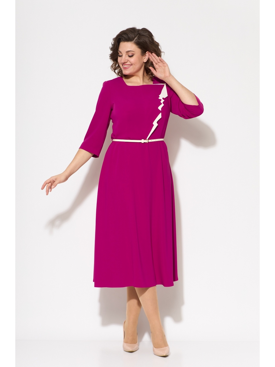 Нарядное женское платье из непрозрачной и ткани средней плотности с добавлением стрейча и вискозы.Отрезное по линии талии.Лиф полуприлегающего силуэта.Юбка расширена к низу,длиной ниже колена.Вырез горловины круглый с застежкой по спинке на потайную молнию.Особенный шарм платью придает декоративная деталь необычной формы из отделочной ткани по центру переда.В качестве дополнительной отделки использован ремень по талии в цвет отделки.