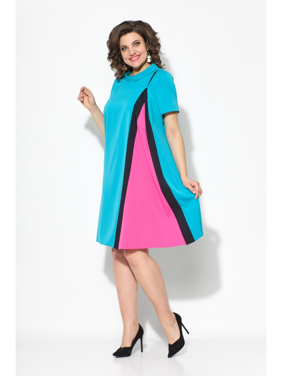 Нарядное женское платье из тонкой непрозрачной ткани с добавлением вискозы. Силуэт расширенный к низу. Длина чуть ниже колена. По переду от плеча ассиметричные детали из ткани контрастных цветов. Рукав короткий. Невысокий воротник хомут с застежкой по спинке на навесную петлю с пуговицей.