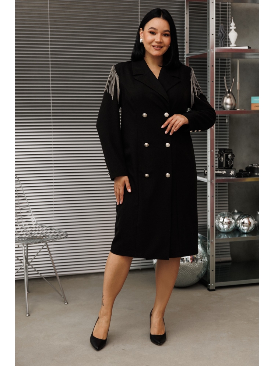 Оформить заказ →Платье женское из текстильной ткани двубортное, полуприлегающего силуэта. По полочке и спинке прилегание создается за счет рельефов, выходящих из проймы. По спинке - средний шов, переходящий в шлицу. Вороник пиджачного типа. Застежка на петли и пуговицы. Рукав втачной двухшовный со шлицей и пуговицами. По окату рукава отделка в виде металлизированной бахромы.