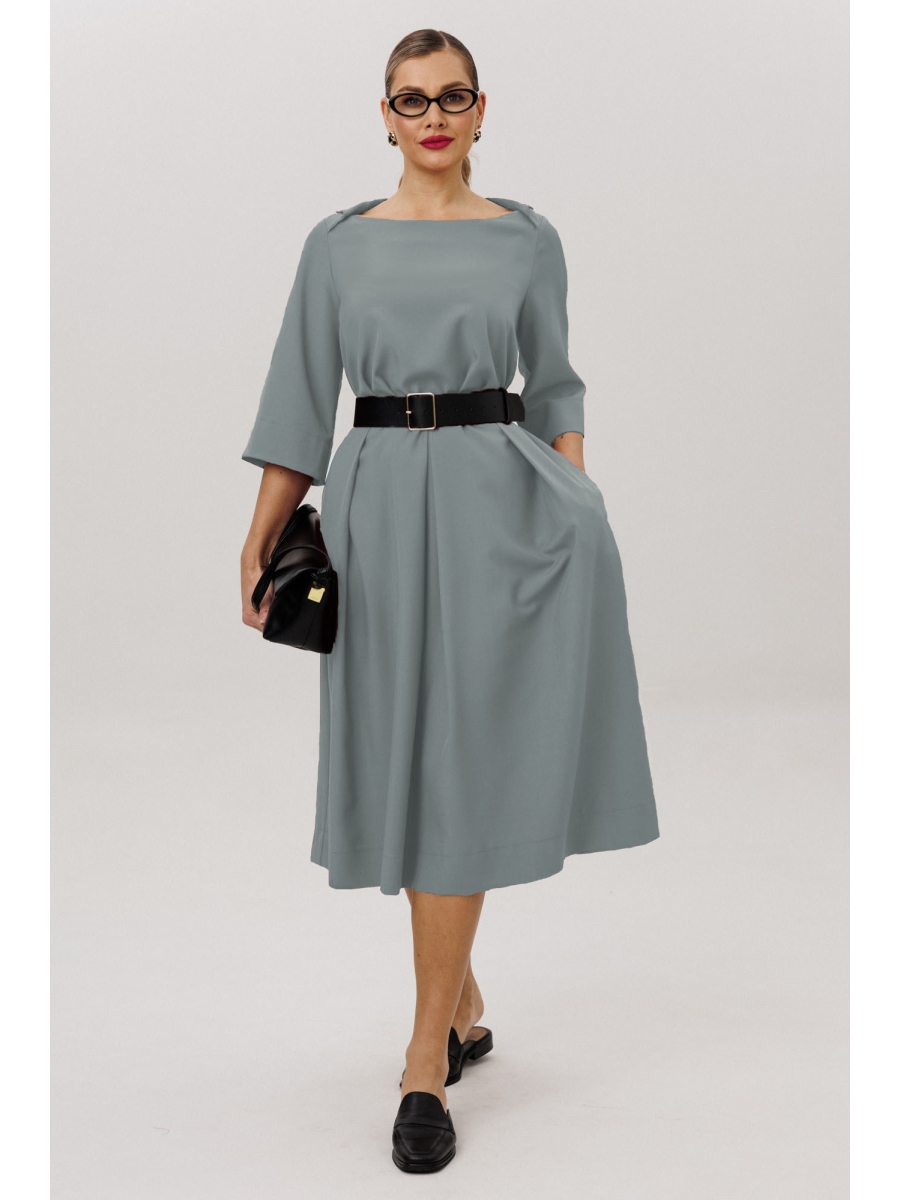 Шикарное платье с ремнем. Отличный вариант универсального изделия: подойдет как для повседневного и офисного гардероба, так и для праздничного выхода. Отрезное по линии талии. По полочке объем груди создается за счет направленных складок из подреза. Объем юбки создается за счет центральной встречной и 2-х односторонних складок. По бокам в юбке-карманы. Рукав втачной, 3/4 длинны с отворотом. Вырез горловины лодочка с отложным воротником.
