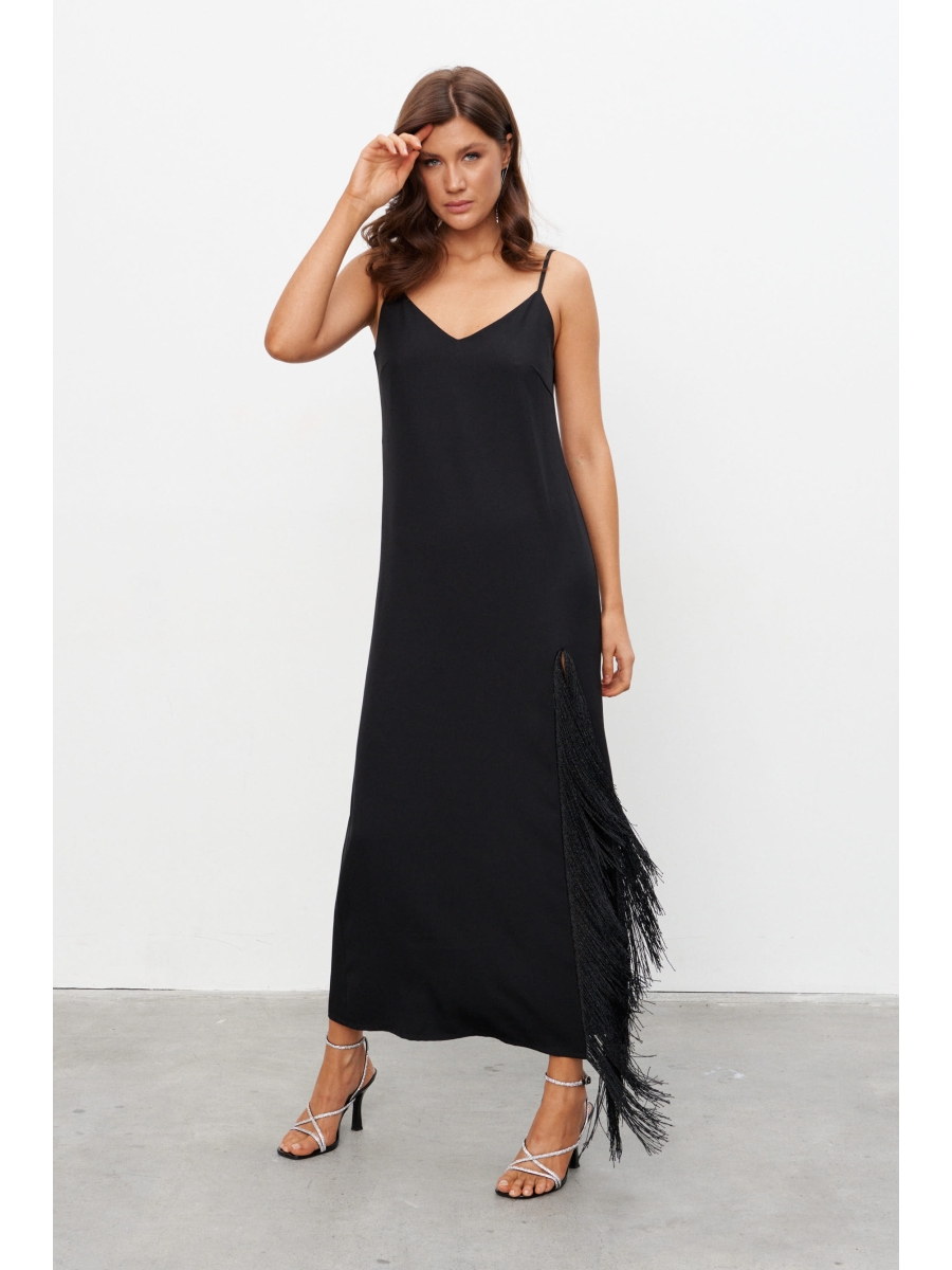 Платье-комбинация из струящейся ткани длиной макси с высоким разрезом, обрамлённым бахромой. Платье на бретелях длину которых можно регулировать. Застёжка на потайную молнию сбоку.