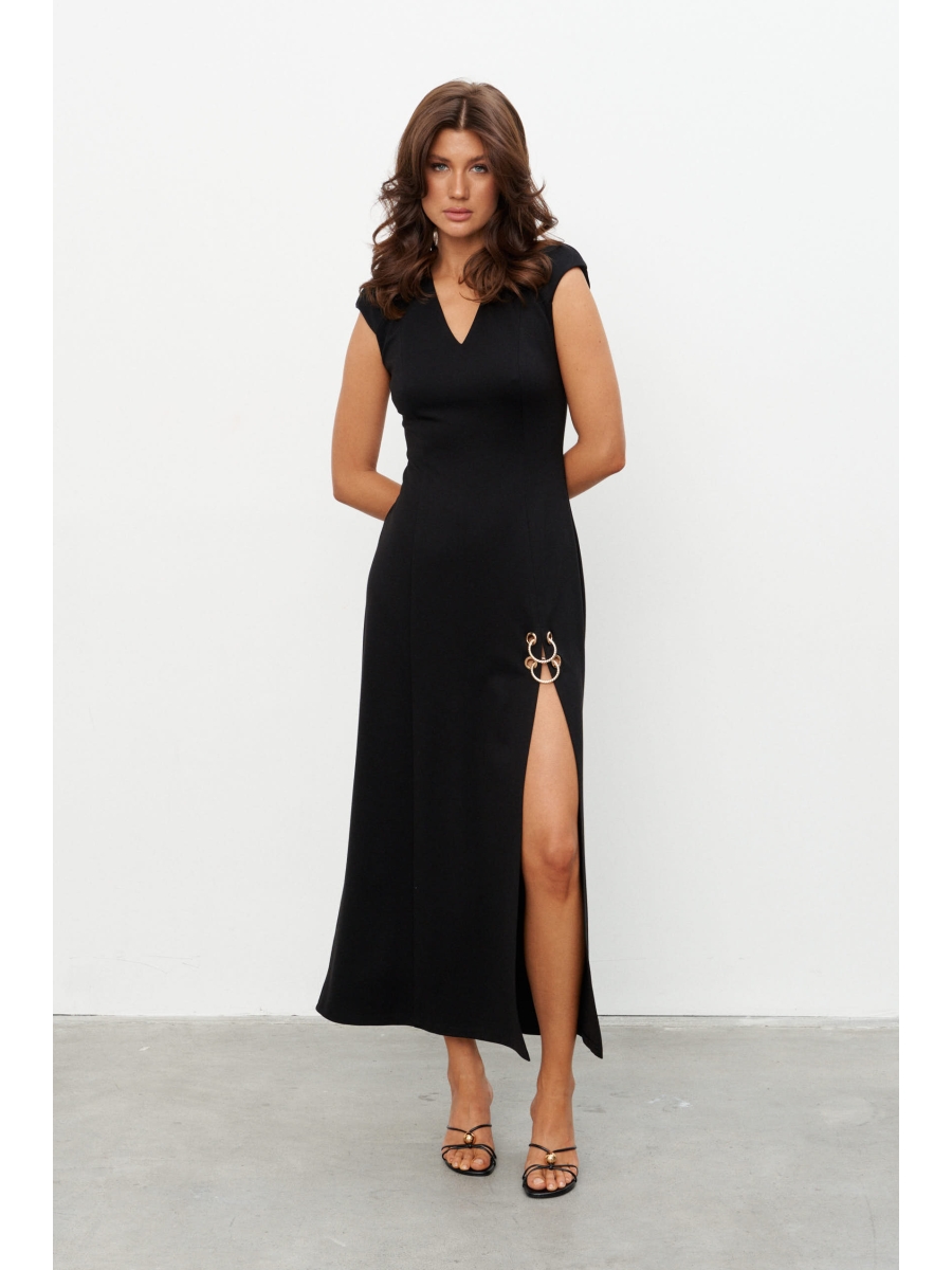 Оформить заказ →Платье из трикотажного полотна приталенного силуэта с расклешённой юбкой с высоким разрезом. Вырез горловины V-образный. По плечам - плечевые накладки. Верх разреза отделан люверсами и кольцами в качестве декора. Застёжка на потайную молнию сзади.
