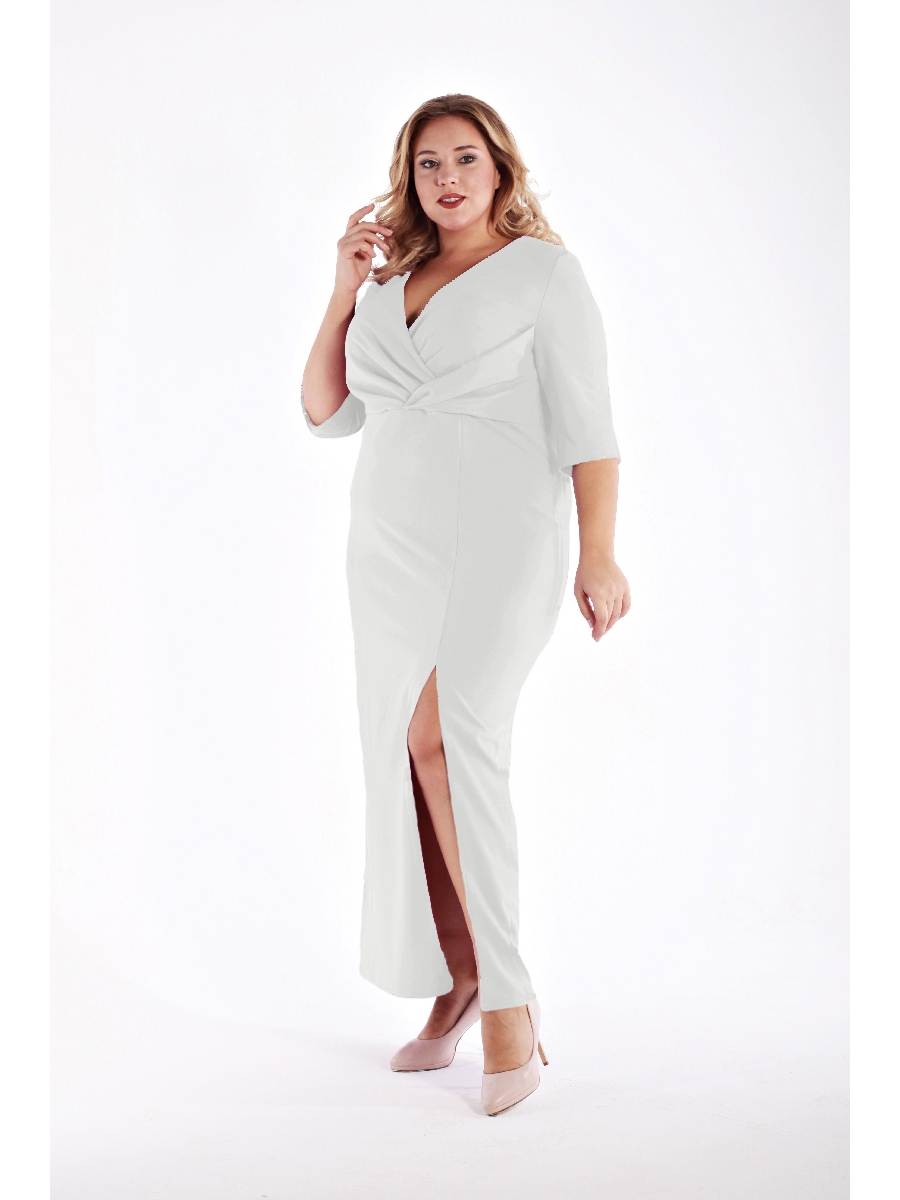 Оформить заказ →Вечернее платье из крепа с эластаном белого цвета. Верхняя часть отрезная по линии талии. По переду оригинальная драпировка. На уровне левого рельефа передней части юбки разрез. Рукав 3/4.