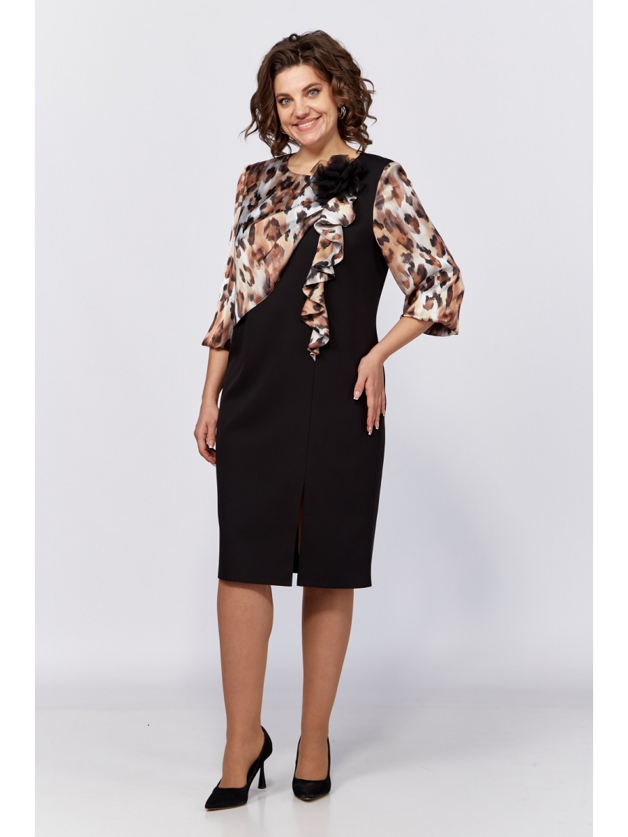Оформить заказ →Нарядное женское платье из непрозрачной ткани средней плотности с добавлением вискозы. Силуэт полуприлегающий, длина чуть ниже колена, вырез горловины круглый с застежкой на потайную молнию по спике. По переду ассиметричная отлетная кокетка из отделочной ткани. В рельеф по переду вставлена декоративная деталь из аналогичной отделочной ткани, длиной 3/4, с небольшим напуском, по низу на резинке. Дополнительную наряядность платью придает съемный декоративный цветок из органзы.