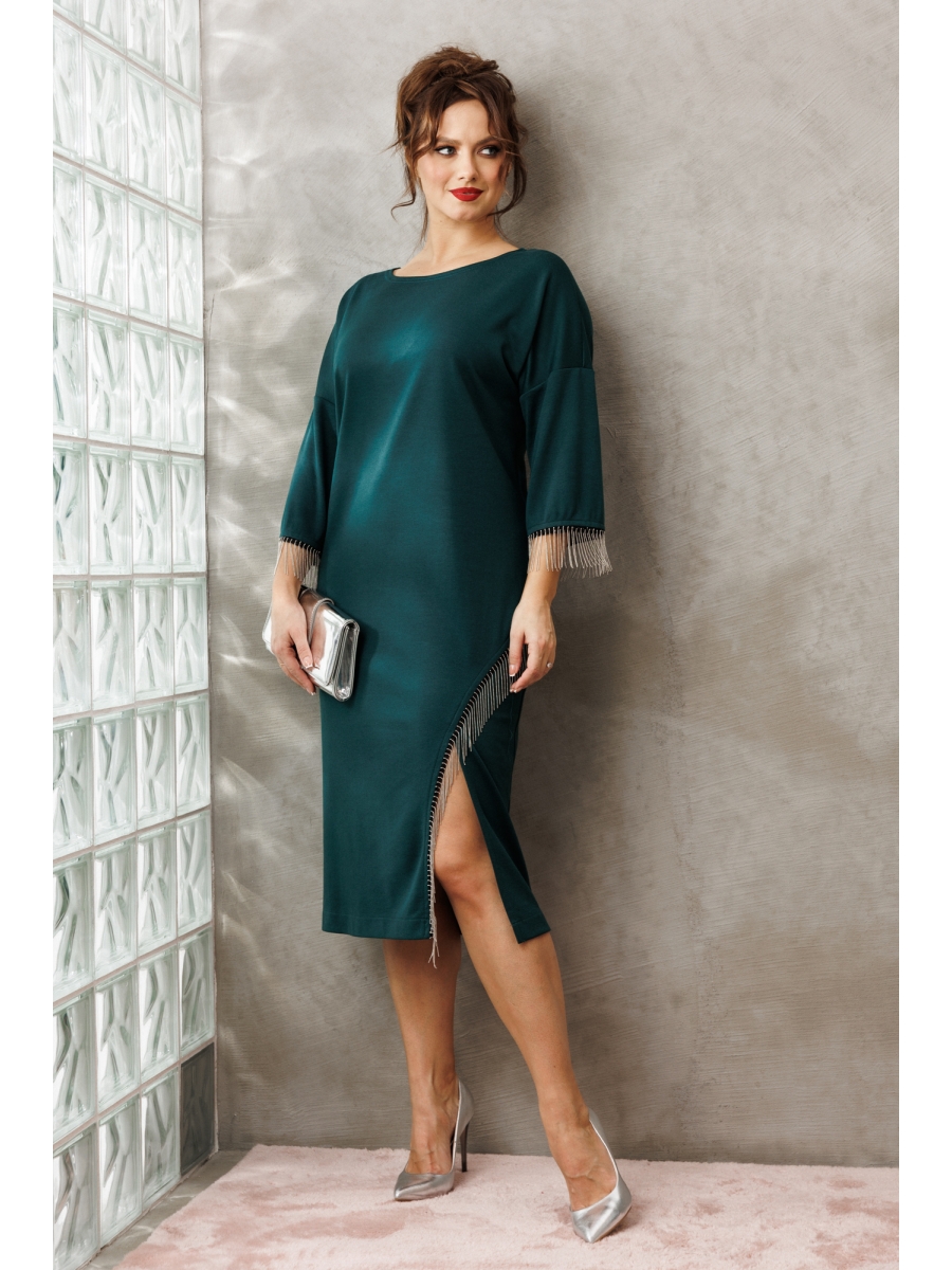 Платье миди — не просто одежда, это заявление о вашем стиле и вкусе. Элегантное праздничное платье прямого силуэта из трикотажного полотна. Ткань не мнется. Благодаря своему крою подойдёт для разных типов фигуры. Оно подчеркнёт вашу индивидуальность и станет отличным дополнением к вашему гардеробу. В нём вы будете чувствовать себя уверенно и комфортно, зная, что выглядите на все сто. Выбирая его, вы выбираете качество, комфорт и стиль. Классическое платье прямого силуэта, со спущенным плечом. По переду идет подрез с разрезом. В качестве декора по подрезу и низу рукава - металлизированная бахрома. По спинке идет средний шов. Такое платье незаменимая вещь в любом гардеробе.