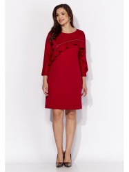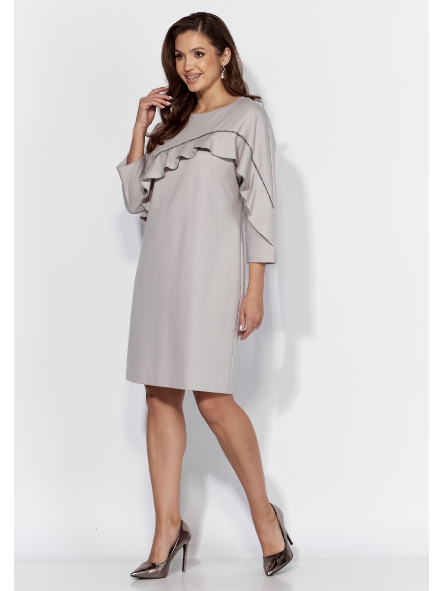Платье женское, прямого силуэта, с цельнокройным рукавом, длинной 7/8. По переду ассиметричный, фигурный подрез, оформлен воланом и отделочной тесьмой. По спинке средний шов. Вырез горловины круглой формы с тонкой, подрезной бейкой.