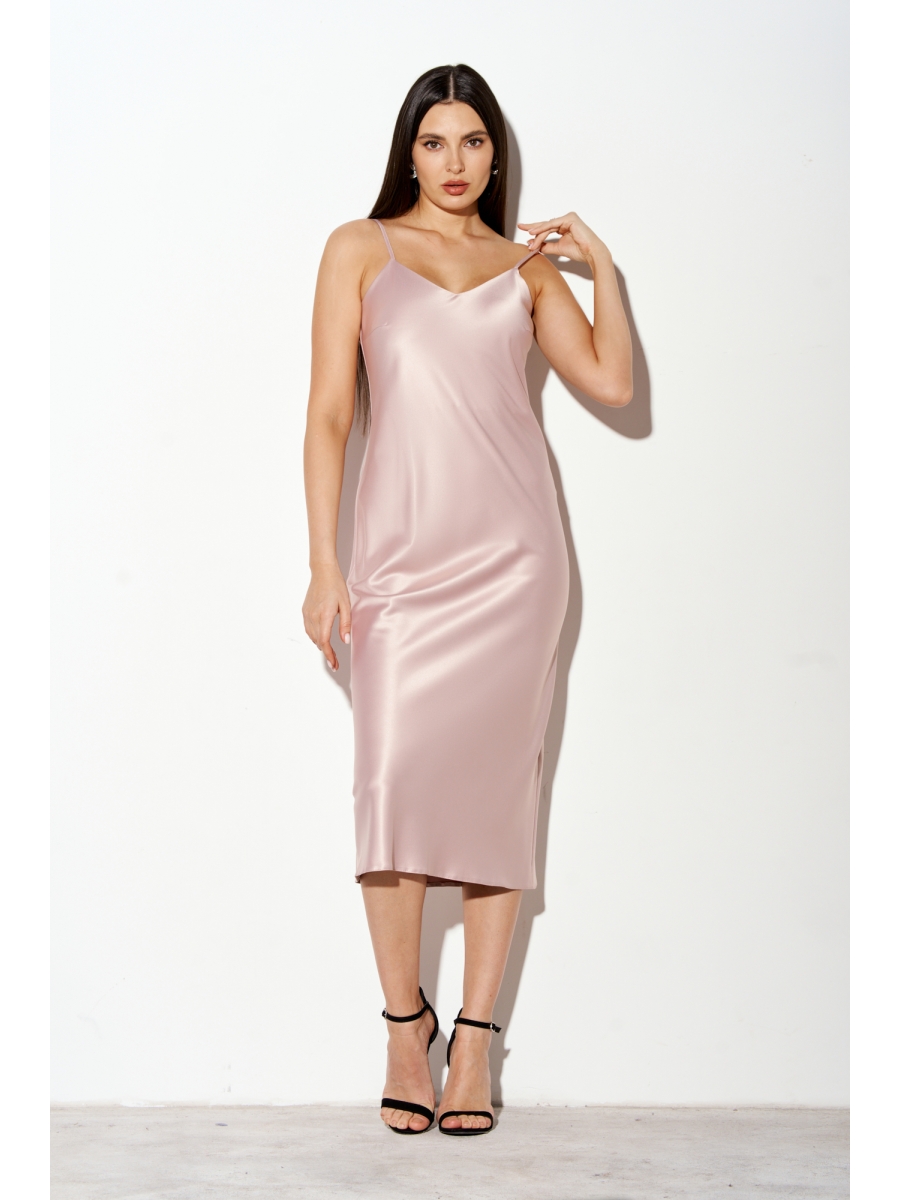 Платье - миди прилегающего силуэта выполнено из струящегося шелк - сатина, на регулируемых бретелях.