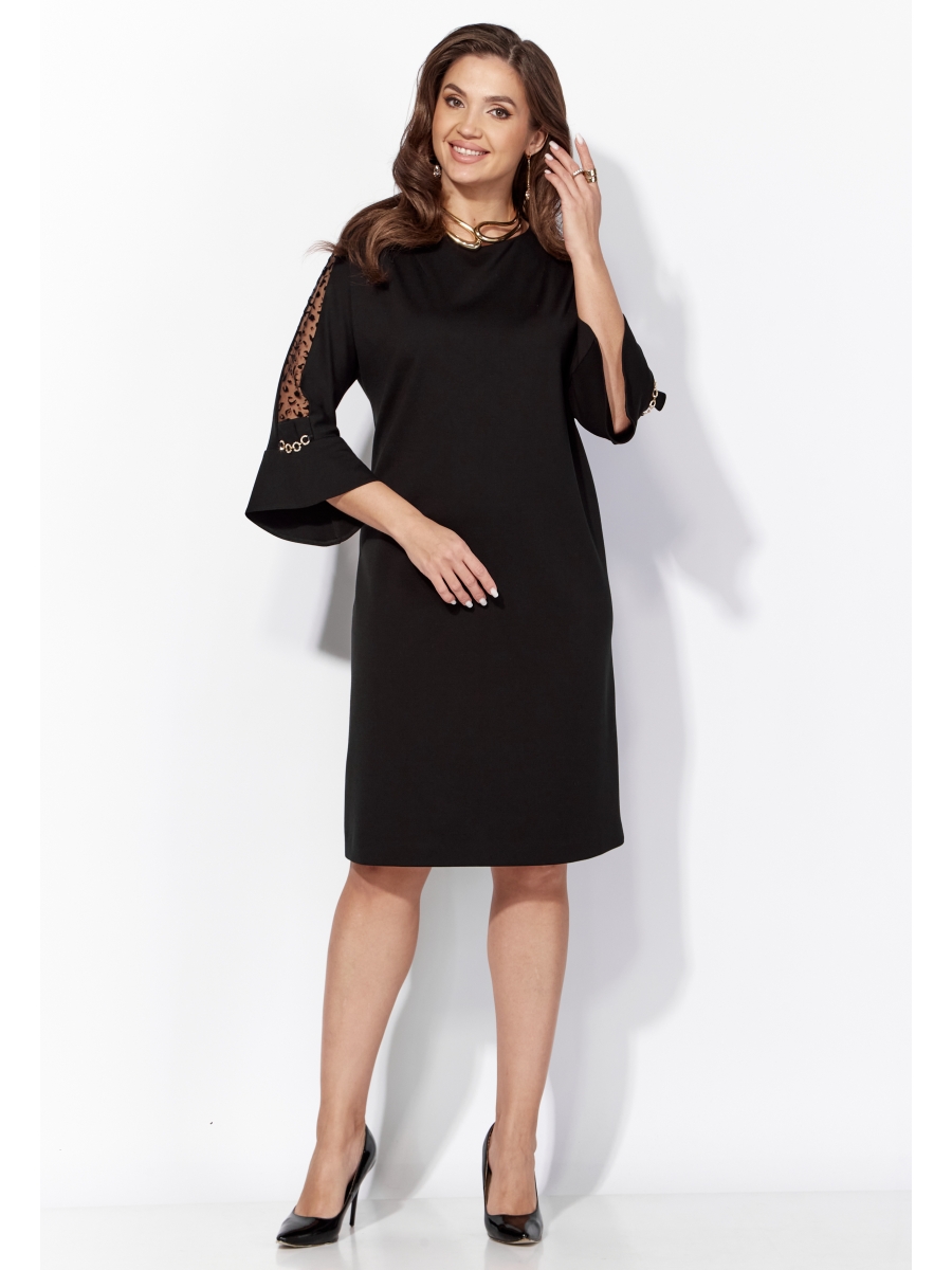 Платье женское, прямого силуэта, зауженное к низу. Рукав цельнокройный, длинной 7/8 с вставкой из принтованной сетки. По низу рукава фигурный волан с отделочной деталью и декором. Вырез горловины круглой формы. Вдоль горловины по переду и спинке декоративные вытачки. По спинке средний шов с разрезом снизу.