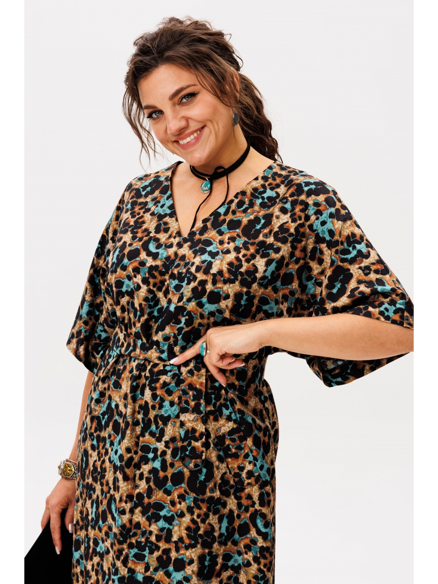 Это платье в цвете «бирюза и бронза» — образец сдержанной элегантности и безупречного вкуса. Его прямой силуэт мягко следует линиям фигуры, создавая лаконичный и при этом выразительный силуэт. Рукав в стиле кимоно добавляет образу легкость и динамику, делая каждое движение плавным и изящным.