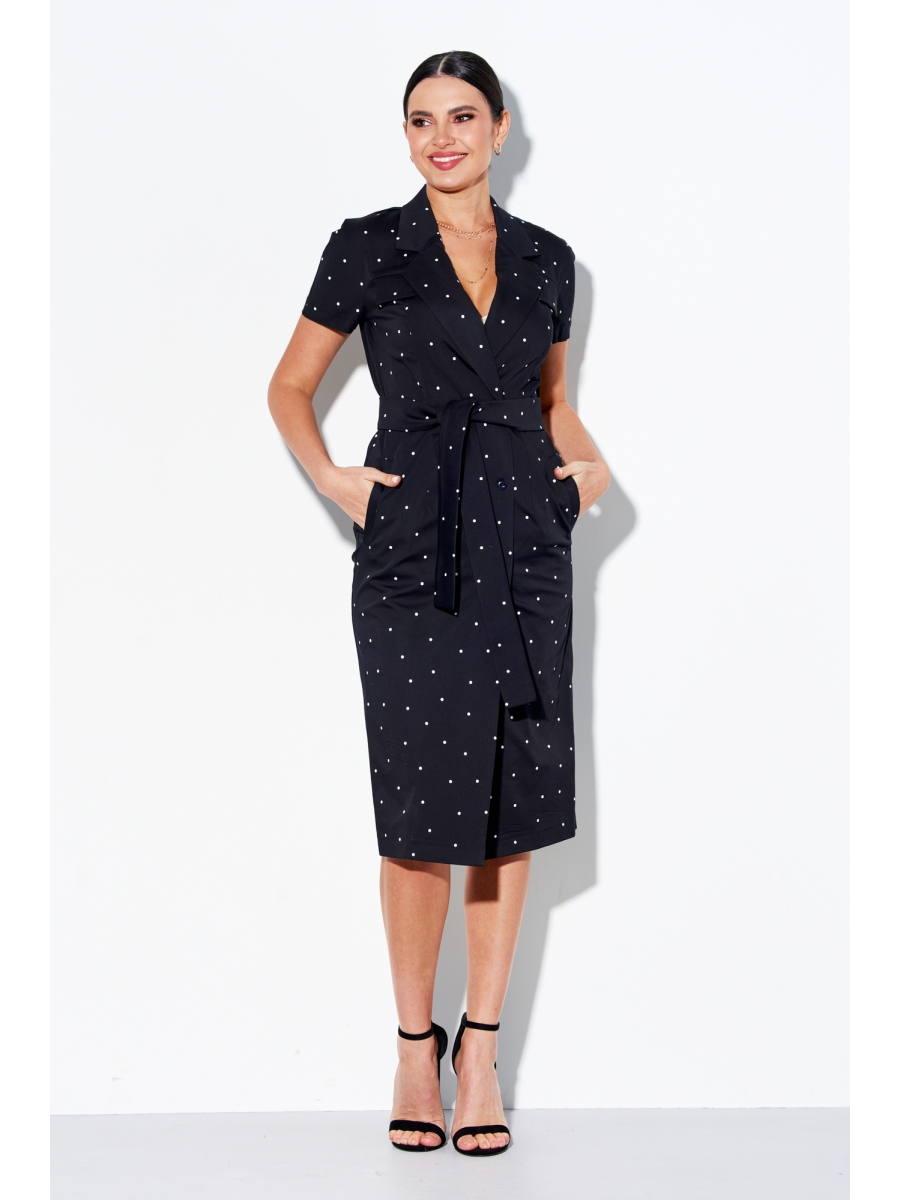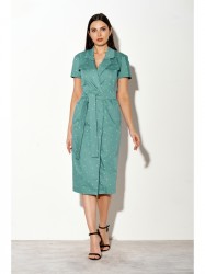 Нарядно-повседневное платье прилегающего силуэта с двубортной застежкой на петли и пуговицы. Рельефы по переду изделия для лучшего прилегания. Прорезной карман с листочкой. Рукав реглан-кокетка с втачным декоративным клапаном. Воротник пиджачного типа, спинка со средним швом. Платье со сьемным поясом.