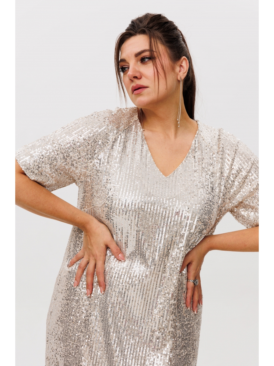 Это не просто платье в пайетках – это исключительная комбинация элегантности и современного шика. Подчеркните свою утонченность и уверенность в себе с его идеальной длиной, V-образным вырезом и безупречным силуэтом. Платье прямого кроя на трикотажной подкладке.