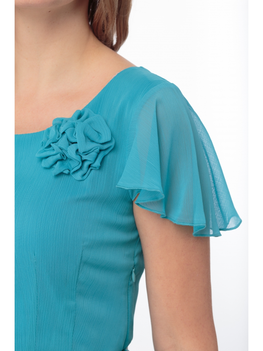 Шифоновое платье на подкладке, полуприлегающего силуэта, среднего объема, длиной до колена. Отрезное по линии талии с юбкой А-силуэта.