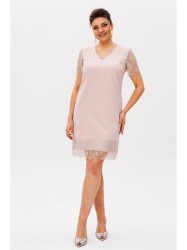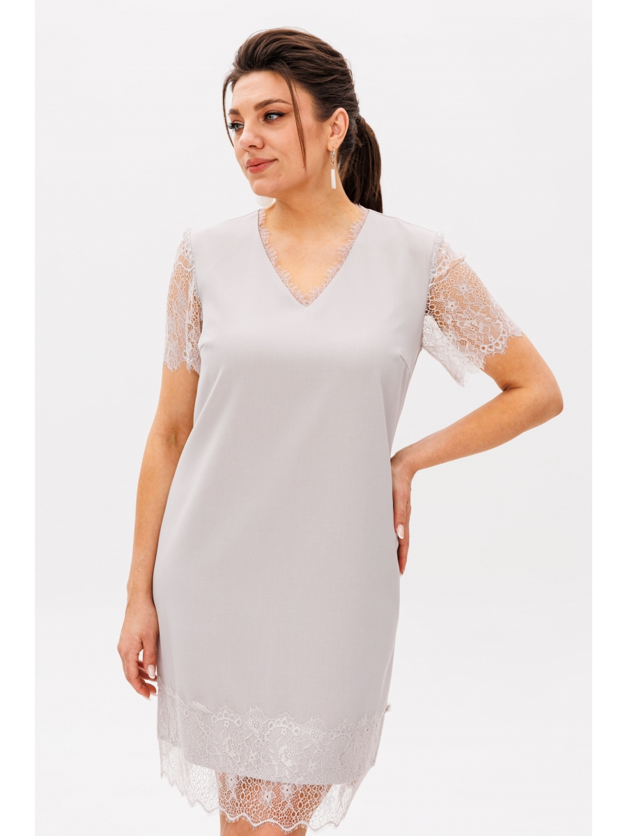 Изящное короткое платье, украшенное изысканным французским кружевом, станет жемчужиной вашего гардероба. Нежное кружево обрамляет V-образный вырез горловины, рукава и подол, добавляя образу воздушности и романтичности.