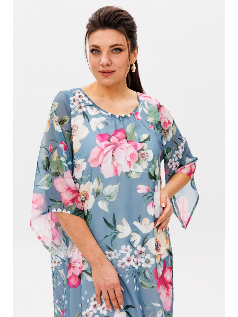 Овальная горловина мягко обрамляет декольте, создавая элегантный кадр для лица. Рукава три четверти с фигурным низом продолжают ботаническую тему — их фестончатый край будто создан самой природой. Воздушная ткань с цветочным принтом живёт своей жизнью: крупные соцветия перетекают по складкам, мелкие бутоны рассыпаются по талии, создавая иллюзию летнего сада.