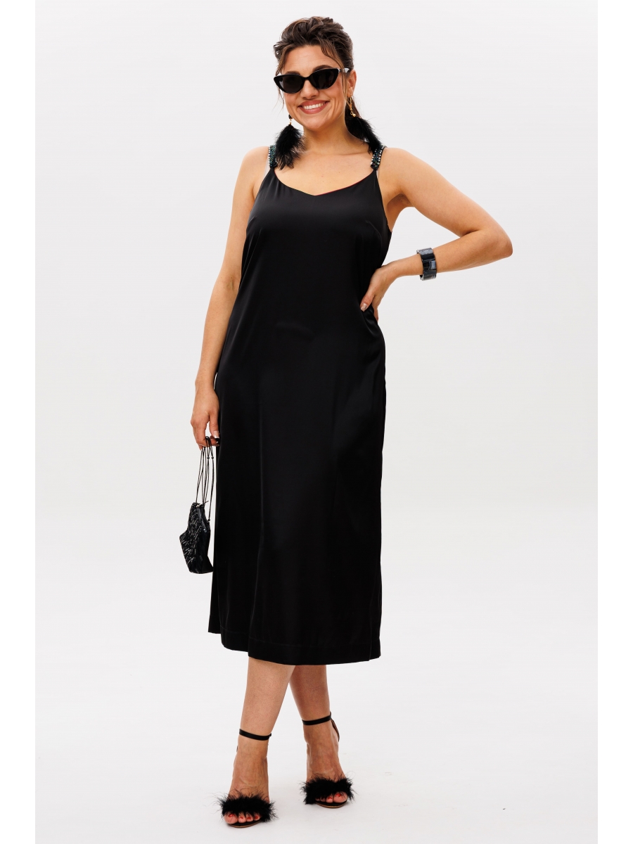 Акцентные съёмные бретели, украшенные россыпью мерцающих бусин, добавляют наряду ноту игривого кокетства, превращая его в настоящее произведение искусства. Каждая бусина ловит свет, создавая игру бликов, которая приковывает восхищённые взгляды. В комплекте – элегантные чёрные бретели на регуляторах, позволяющие идеально подогнать длину и создать безупречный силуэт, подчёркивающий линию плеч.