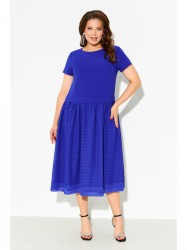 Женское нарядное платье полуприлегающего силуэта с цельнокроенными рукавами. Верх изделия выполнен из лёгкой струящейся ткани. Нижняя часть платья выполнена из французкого кружева на подкладке из крепа.