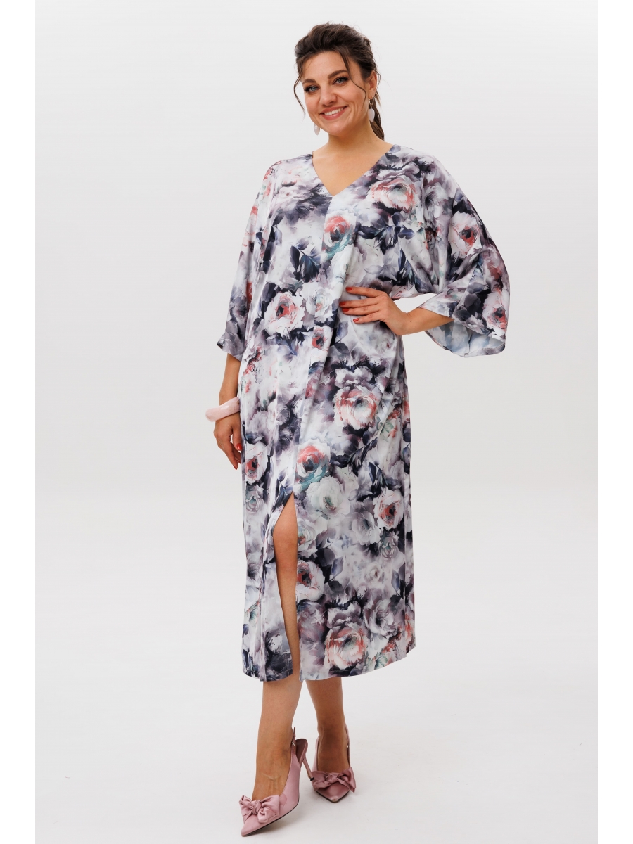Это платье в цвете «фарфоровый розарий» — воплощение утонченной элегантности и безупречного стиля. Его лаконичный прямой силуэт мягко облегает фигуру, подчеркивая естественную грацию, а цельнокроеные рукава создают ощущение гармоничного единства формы и комфорта. Глубокий V-образный вырез придает образу ноту изысканности, деликатно акцентируя благородные линии шеи и декольте. Передняя часть платья украшена выразительным средним швом, дополненным изящным разрезом, который придает наряду динамику и современное звучание.