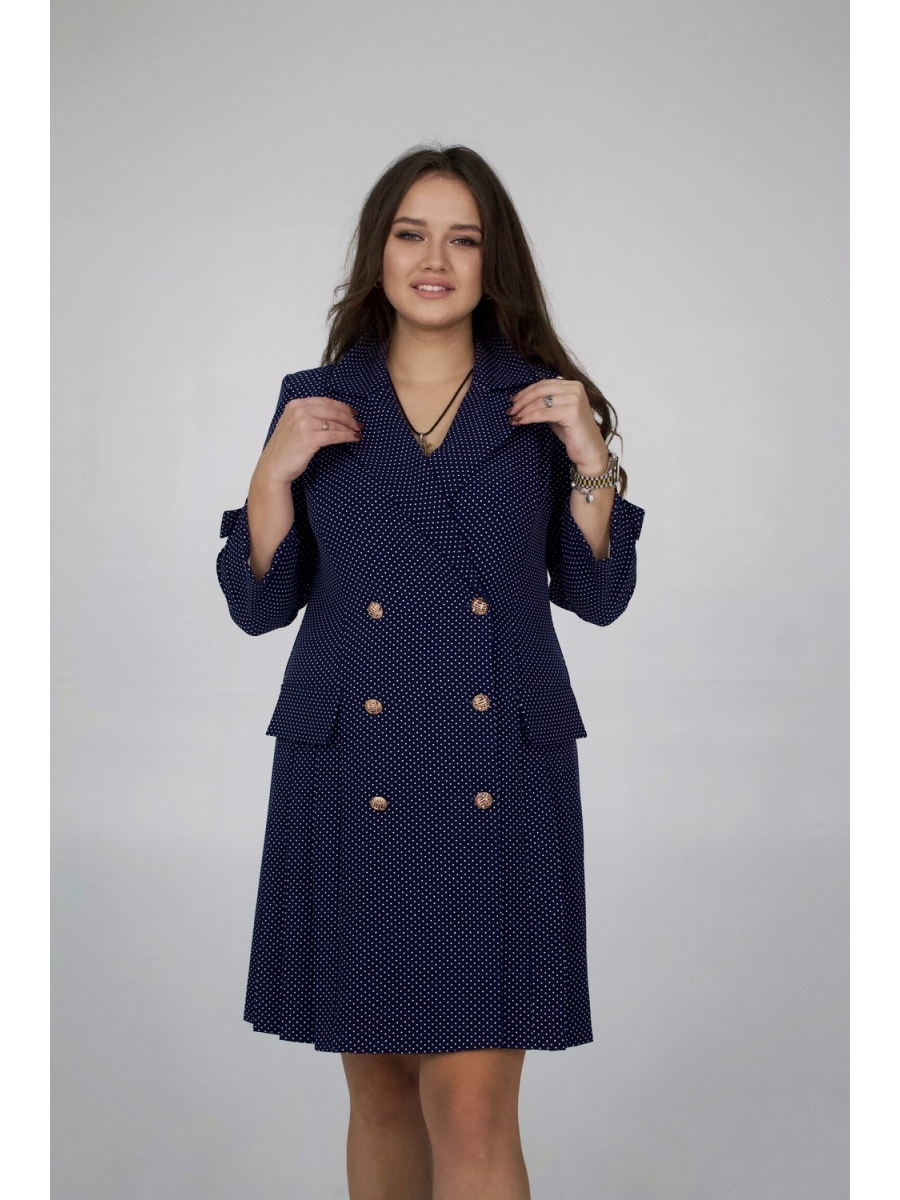 Платье женское полуприлегающего силуэта, двубортное, с втачным рукавом. По горловине классический воротник с лацканами. Перед и спинка с вертикальными рельефами от плечевого шва. По бокам односторонние складки. По переду декоративные клапаны. Рукав длиной 7/8, по низу декоративная пата с пуговицей.