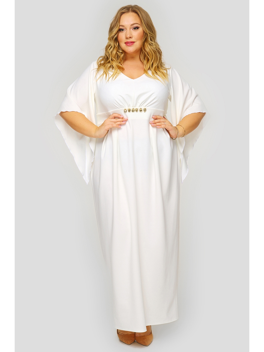 Вечернее платье полуприлегающего силуэта. V-вырез горловины по переду и по спинке. Рукав в виде "крыла" заканчивается углом по нижнему шву. Верхняя часть отрезная, на подкладке, со сборкой по центру переда под линией груди. Двойной втачной пояс. Юбка "тюльпан" с разрезом по центральному шву задней половинки.