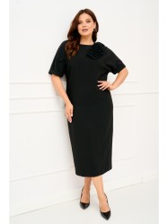 Женское платье полуприлегающего силуэта выполнено из плательной ткани со втачными рукавами и декоративным несъемным цветком; по спинке вырез в виде "капельки", который застегивается на петлю и пуговицу; по низу - шлица.