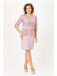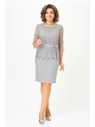 Платье женское прилегающего силуэта с втачным рукавом. Верхняя часть переда с рельефами из проймы. По переду отрезной пояс и баска. Спинка платья со средним швом, с застежкой молнией и разрезом. Рукав длиной ¾. Верхняя часть переда, баска и рукав выполнены из кружева. На поясе декоративный бант.