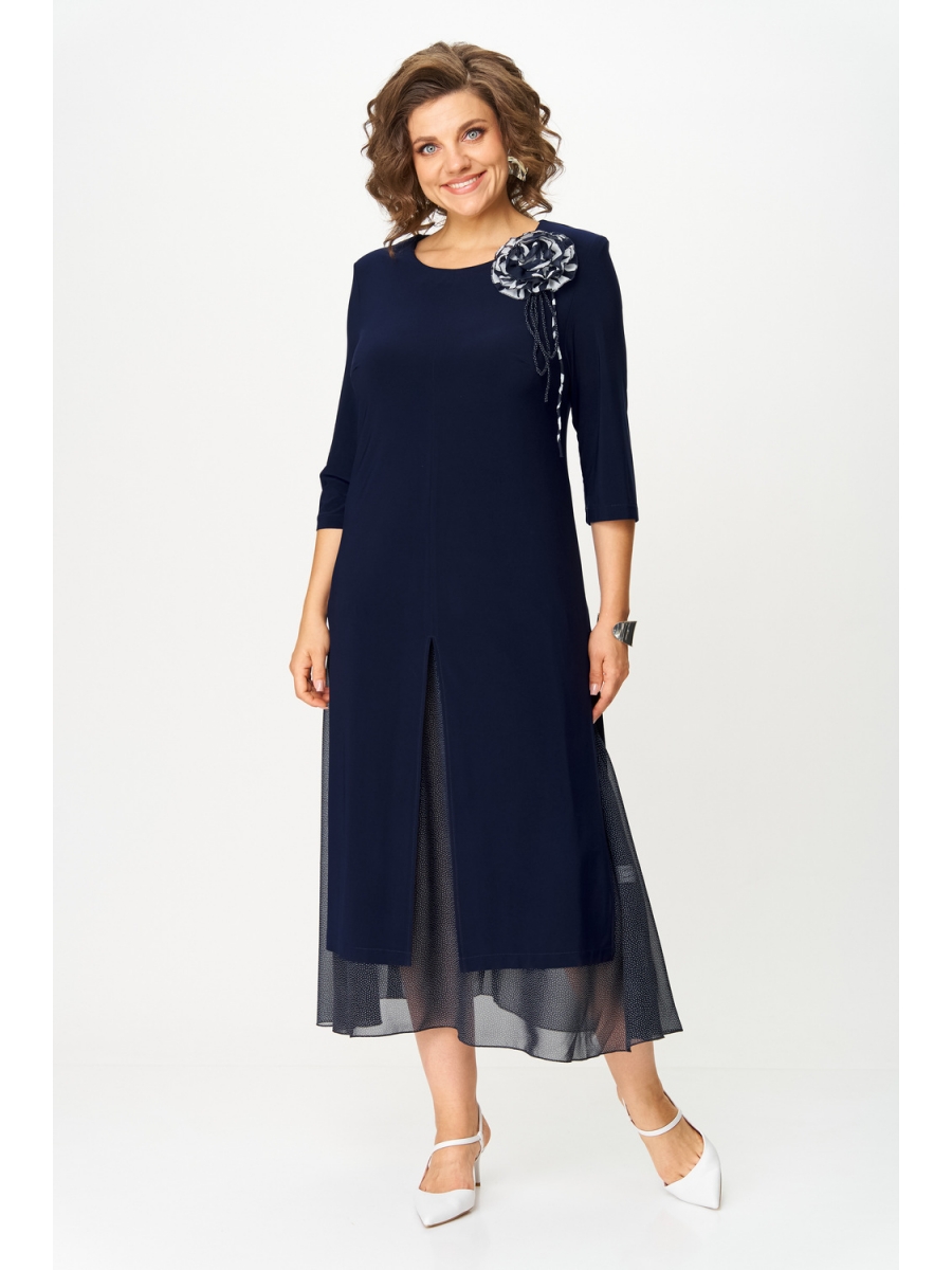Платье женское полуприлегающего силуэта расширенное к низу, выполнено в комплектации из двух предметов. Верхнее платье – из мягкого эластичного материала, с высокими разрезами по переду, спинке и бокам, с втачным рукавом ¾. По линии груди вытачки. По левой части переда съемный цветок.