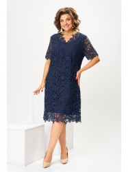 Платье женское относится к нарядной торжественной одежде. Платье полуприлегающего силуэта, слегка расширено к низу, длиной за колено. Перед с отрезной кокеткой и двумя нагрудными вытачками. Спинка с отрезной кокеткой и двумя талиевыми вытачками. Горловина с V-образным фигурным вырезом. Рукав втачной короткий, одно шовный. Платье на подкладке. Застежка на потайную тесьму-молнию в левом боковом шве платья.