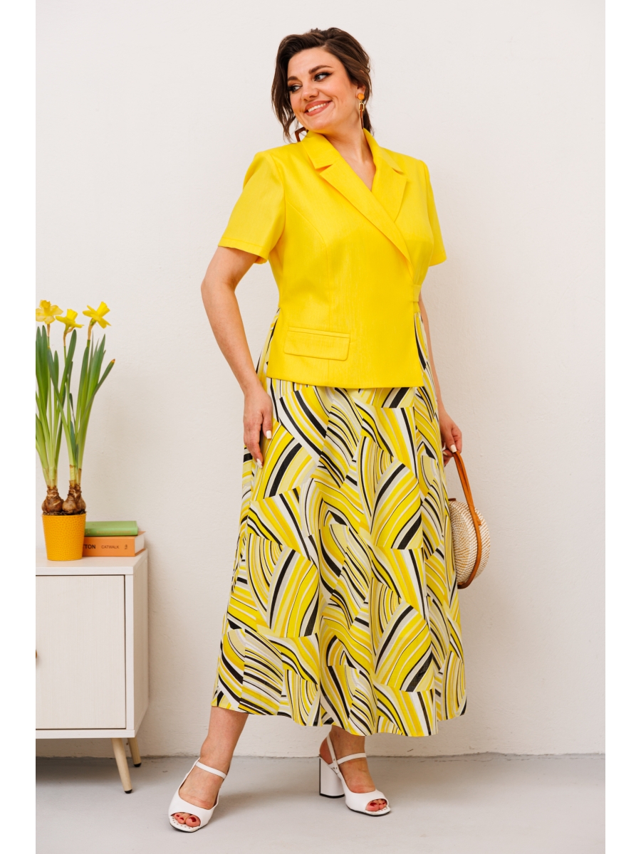 Оформить заказ →Платье женское выполнено в виде имитации жакета и юбки. Платье отрезное по линии талии. Верхняя часть платья выполнена в виде жакета, с асимметричным передом с запахом. Верхняя часть переда (жакета) с двумя отрезными бочками, на правой части переда обработан отрезной карман с клапаном и 2-мя обточками. Нижняя часть переда (юбка) цельнокроеная. Верхняя часть спинки (жакета) со средним швом и 2-мя отрезными бочками. Нижняя часть (юбки)-цельнокроеная. Горловина с V-образным вырезом, с втачным воротником пиджачного типа с отрезным лацканом. Застёжка на 2-е обмётанные петли на поясе и 2-е пришивные пуговицы на бочке спинки. Рукав втачной 2-х шовный. Верхняя часть платья и нижняя на подкладке. Платье с плечевыми накладками.