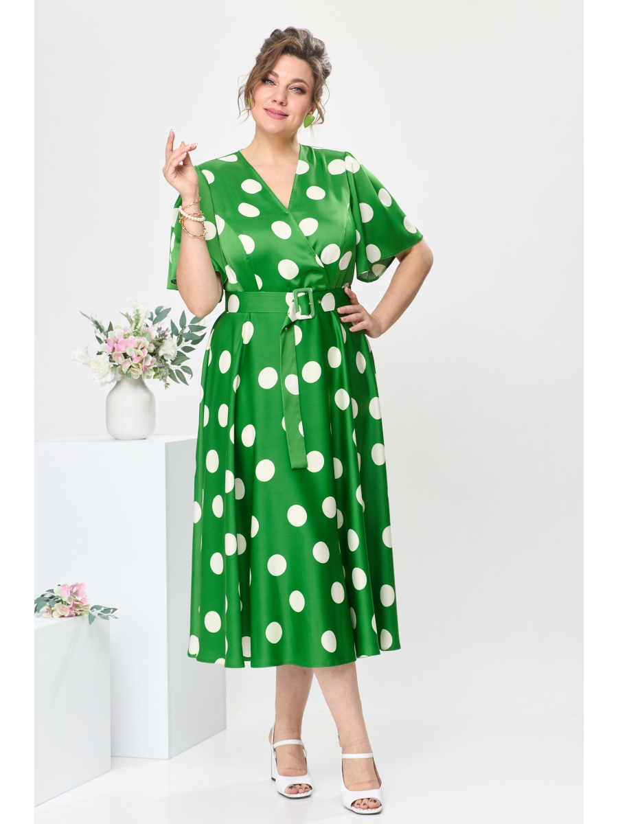 Оформить заказ →латье женское, относится к торжественной одежде. Платье женское, отрезное по линии талии, расширенное к низу. Верхняя часть переда с 2-мя отрезными бочками, нижняя без конструктивных особенностей. Верхняя часть спинки со средним швом и 2-мя таллиевыми вытачками, нижняя без конструктивных особенностей. Горловина с V-образным вырезом, с запахом, обтачная без воротника. Застёжка на потайную тесьму-молнию в левом боковом шве платья. Рукав втачной, одно шовный, расширенный к низу, 2-мя односторонними складками по окату, рукав короткий. Платье с плечевыми накладками. К платью прилагается съёмный пояс с застёжкой на пряжку и пробивные блочки.