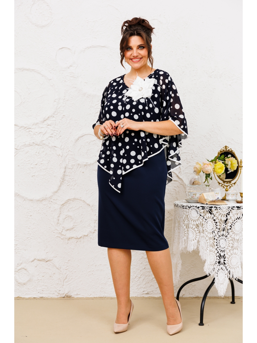 Платье женское относится к нарядной торжественной одежде. Платье женское полу прилегающего силуэта, длиной за колено. Платье с отлётной накладкой. Перед с 2-мя нагрудными вытачками и 2-мя таллиевыми вытачками. Спинка с 2-мя таллиевыми вытачками и средним швом, заканчивающимся шлицей. Горловина круглая обтачная без воротника, по горловине закреплено накладка с фигурным низом, обработанным косой бейкой из отделочной ткани. Застёжка на потайную тесьму-молнию в левом боковом шве платья. Платье без рукавов. Проймы обтачке, по краю пройм отделочная строчка 0,6 см.