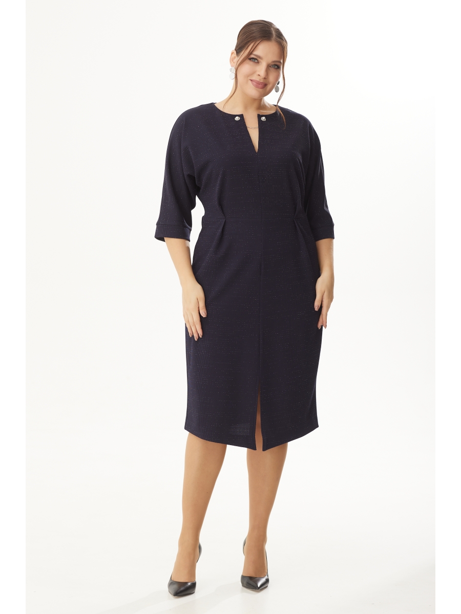 Нарядное женское платье из фактурного трикотажа в люрексовую точку прекрасно подойдет для рабочих будней, а также торжественных мероприятий. Перед и спинка изделия с центральным и таливым швами, застроченные встречные складки на лифе служат вытачками, а в юбке дают дополнительный объем и необычный силуэт. Платье заужено к низу. Передняя часть удлинена и имеет разрез. Рукав "летучая мышь" цельнокроеный 3/4, с пристроченной манжетой. Горловина лодочка с разрезом, который украшает цепочка вставленная в блочки.