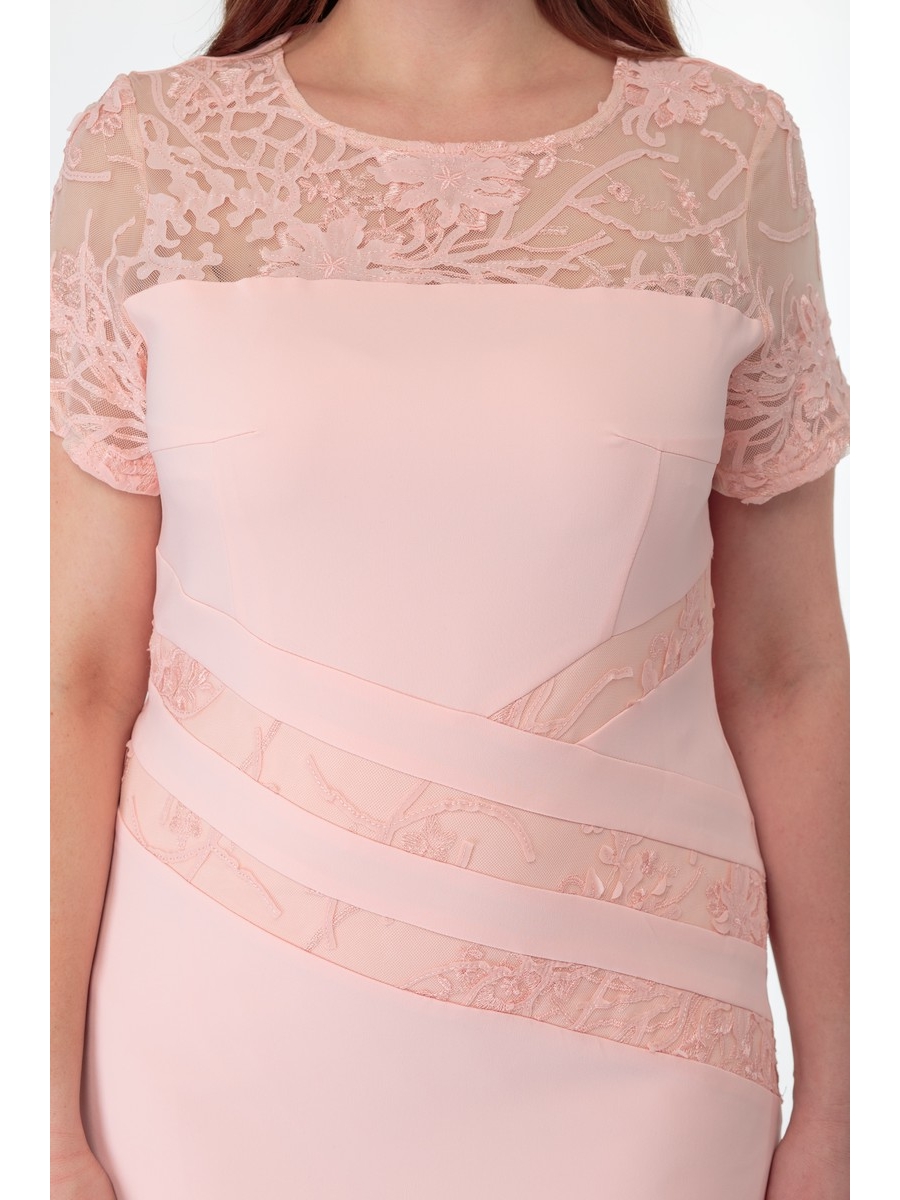 Платье, выполненное в красивых оттенках пудрового с отделкой из кружевного полотна.