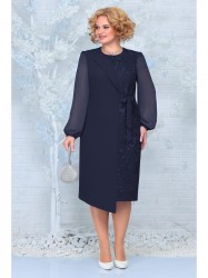 Платье женское, полуприлегающего силуэта, чуть зауженное к низу, на подкладке из дышащей, приятной на ощупь и достаточно эластичной ткани. Длина 107,0 см. по среднему шву спинки. Деталь переда асимметричная и не ровная по низу. В косой подрез выходящий справа налево от горловины до талии вставлен лацкан, в низу деталь удлиняется на 8,0 см. Левая боковая часть из гипюра. На талии завязан бант из шифона. Нагрудные вытачки выходят из проймы. Спинка с талевыми вытачками, в среднем шве обработана застёжка на потайную тесьму молнию и шлица. Горловина круглая, углублённая спереди, обтачная. Шифоновые рукава втачные, одношовные, длиной 63,0 см. со сборкой по окату, присборенные на резинку по низу. Изделия с плечевыми накладками.