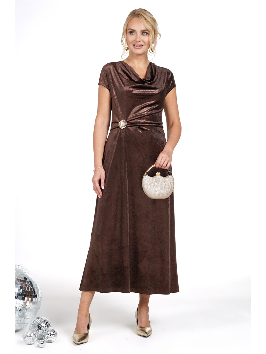 Оформить заказ →Платье полуприлегающего верху силуэта с расширением книзу, со спущенной линией плеча. Перед отрезной по линии талии, с драпировками выходящие от правого бокового декорированные пришивным украшением. Спинка со средним швом. Вырез по переду оформлен драпированной «качелей».