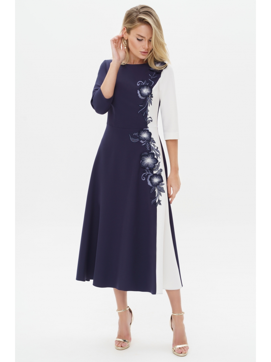 Платье женское полуприлегающего силуэта на подкладке, отрезное по линии талии, двухцветное. Платье нарядное. По переду платья идет декоративная отделка - вышивка с объемными элементами. Верхняя часть переда с рельефными швами, выходящими из проймы и идущими до уровня линии талии. Нижняя часть платья переда с одним рельефным швом с левой стороны на продолжении рельефного шва верхней части. По левому рельефному шву идет вышивка с объемными элементами. Левая часть переда - из отделочного материала. Спинка со средним швом, в котором обработана застежка на потайную тесьму-молнию. Верхняя часть спинки с рельефными швами, выходящими из проймы и идущими до шва на талии. Рукава втачные одношовные длиной 3/4. Горловина овальной формы, обтачная.