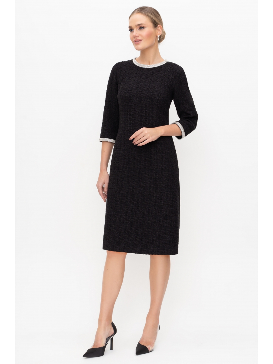 Создайте неповторимый образ с черным твидовым платьем, украшенным сверкающим стеклярусом! Это идеальный выбор для любого праздничного мероприятия. Выполненное из твидовой ткани с изысканной отделкой, это платье подчеркнет вашу элегантность и женственность. В этом платье вы будете звездой вечера! Платье женское, полуприлегающего силуэта, на подкладке, из твидовой текстурированной ткани, украшенное по горловине и низу рукава декоративной тесьмой из стекляруса (тесьма может незначительно отличаться от фото). Перед платья с талиевыми и нагрудными вытачками. Спинка платья с талиевыми вытачками и средним швом, в котором обработана застежка на потайную тесьму-молнию. Горловина круглой формы, обтачная, застегивается на пришивной потайной крючок. Рукава реглан, длиной ¾, идущие от горловины с верхним и нижним швами.