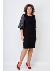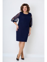 Женское, нарядное платье свободного кроя. По линии груди на полочке нагрудные выточки. Спинка со средним швом, переходящим в шлицу. Горловина-округлая. Рукав втачной, 3/4 выполнен из двойной сетки с красивой вышивкой, заканчивающийся манжетой из основной ткани. Нижняя часть сетки короче верхней, за счет чего дает пышность рукаву. Платье на подкладке.