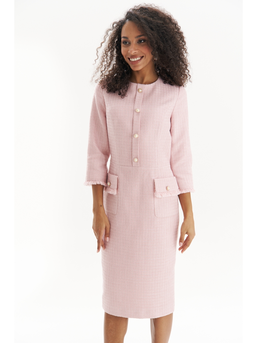 Элегантность в каждой детали – это приталенное твидовое платье. Лаконичный крой подчеркивает фигуру, создавая утонченный силуэт, а жемчужные пуговицы добавляют образу нотку аристократичности. Стильные накладные карманы с бахромой придают модели легкий акцент шика, сохраняя при этом классическую сдержанность. Укороченные рукава подчеркивают запястья, создавая возможность дополнить образ изящными аксессуарами. Идеальное решение для деловых встреч, светских мероприятий или утонченного повседневного стиля.