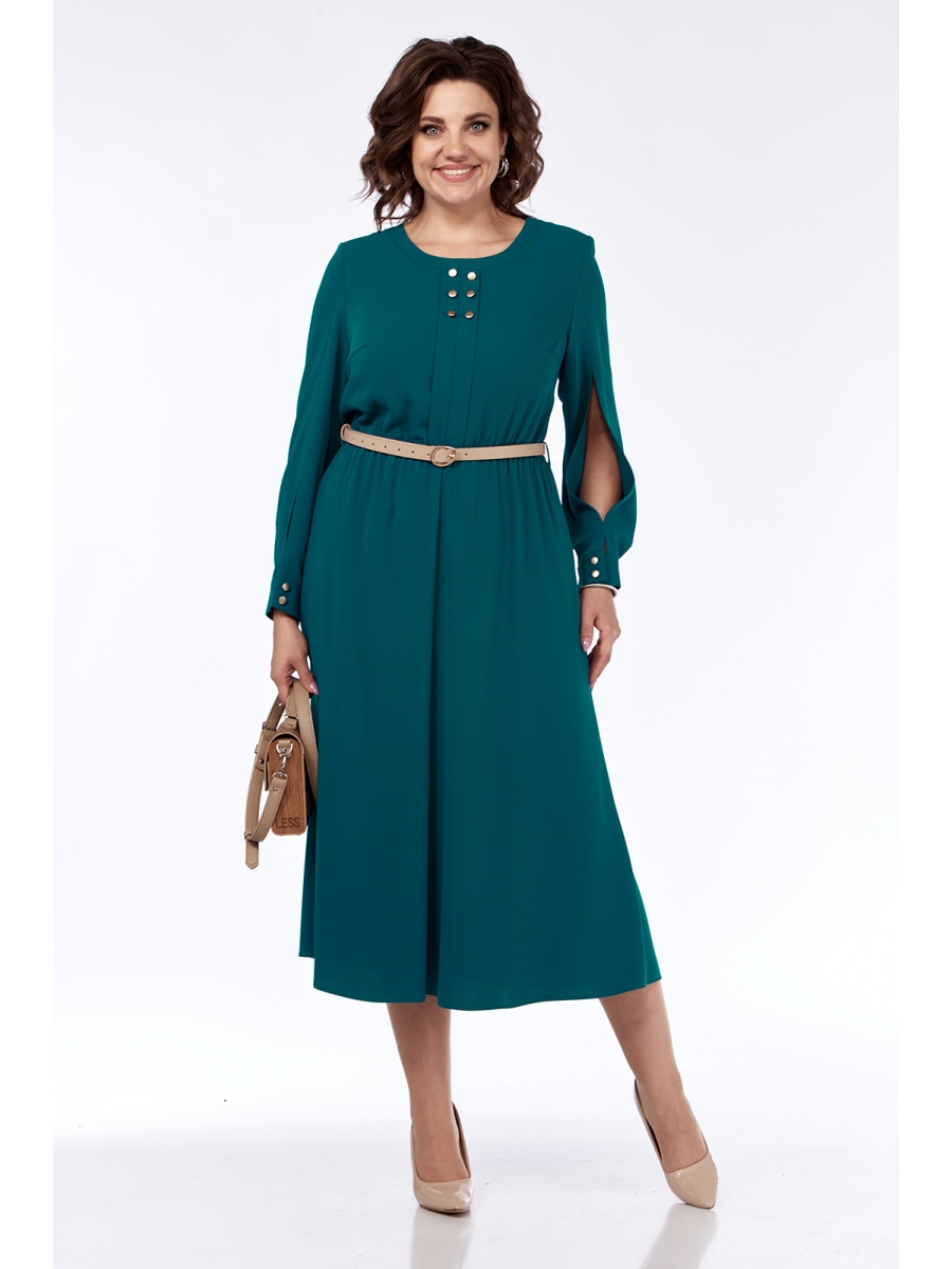Платье женское, нарядное, А-силуэта, выполнено из плательной ткани. Горловина округлой формы обработана планкой. Платье отрезное по линии талии и собрано на эластичную тесьму. По центру лифа складка декорированная пуговицами. Верхняя часть спинки цельная. Юбка платья 4х-клинка. В боковых швах имеются карманы. Рукава втачные двухшовные по переднему шву разрез, на манжете с застежкой на две петли с пуговицами. Платье дополнено съемным ремнем.