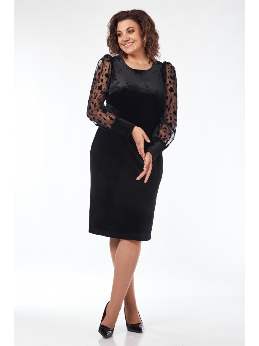 Платье женское, нарядное, изготовлено из велюра на трикотажной основе и органзы с флоком, полуприлегающего силуэта. Горловина обработана декоративной тесьмой. Перед с нагрудными вытачками. Спинка со средним швом, в котором обработаны шлица и застежка на навесную петлю и пуговицу. Линия плеча заужена. Рукав втачной широкий на манжете. Платье на подкладке.