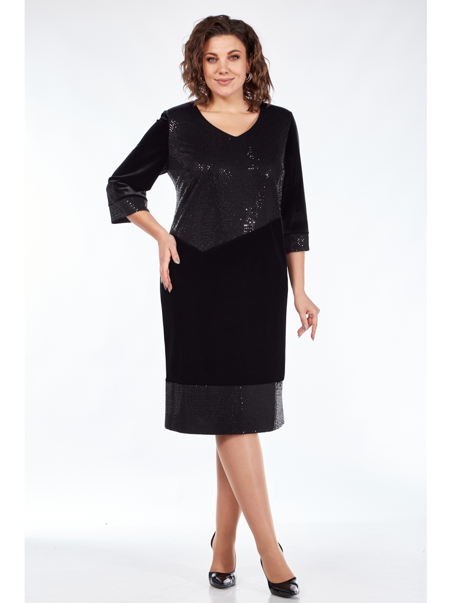 Платье женское, прямого силуэта, слегка зауженное к низу. Изготовлено из велюра и отделочной ткани с пайетками. Горловина фигурной формы. По переду обработаны нагрудные вытачки. Платье отрезное по талии. По лифу платья, низу изделия и низу рукавов — отделочная ткань. По спинке средний шов и разрез внизу. Рукава втачные, длиной 3/4.