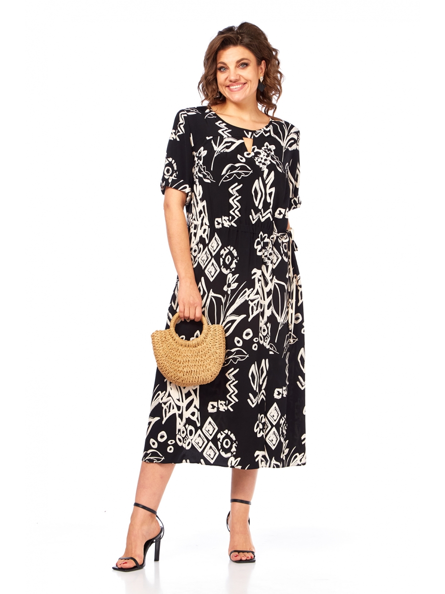 Платье женское, нарядное, А-силуэта, изготовлено из плательной ткани. Горловина круглой формы обработана окантовкой, на спинке застежка на петлю и пуговицу. Рукав втачной. Перед с асимметричным подрезом, в котором обработан вырез горловины и разрез. По линии талии имеется кулиса с декоративными завязками. В левой верхней части переда кокетка от которой заложены складки. Спинка цельнокроенная.