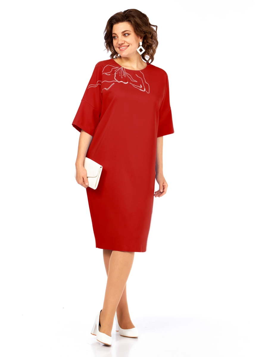 Платье женское, нарядное свободного силуэта. Выполнено из ткани костюмно-плательного ассортимента. Горловина округлой формы. Перед цельнокроеный дополнен дизайнерской вышивкой. Спинка со средним швом в котором обработана застежка на навесную петлю и пуговицу. Рукав спущенный.
