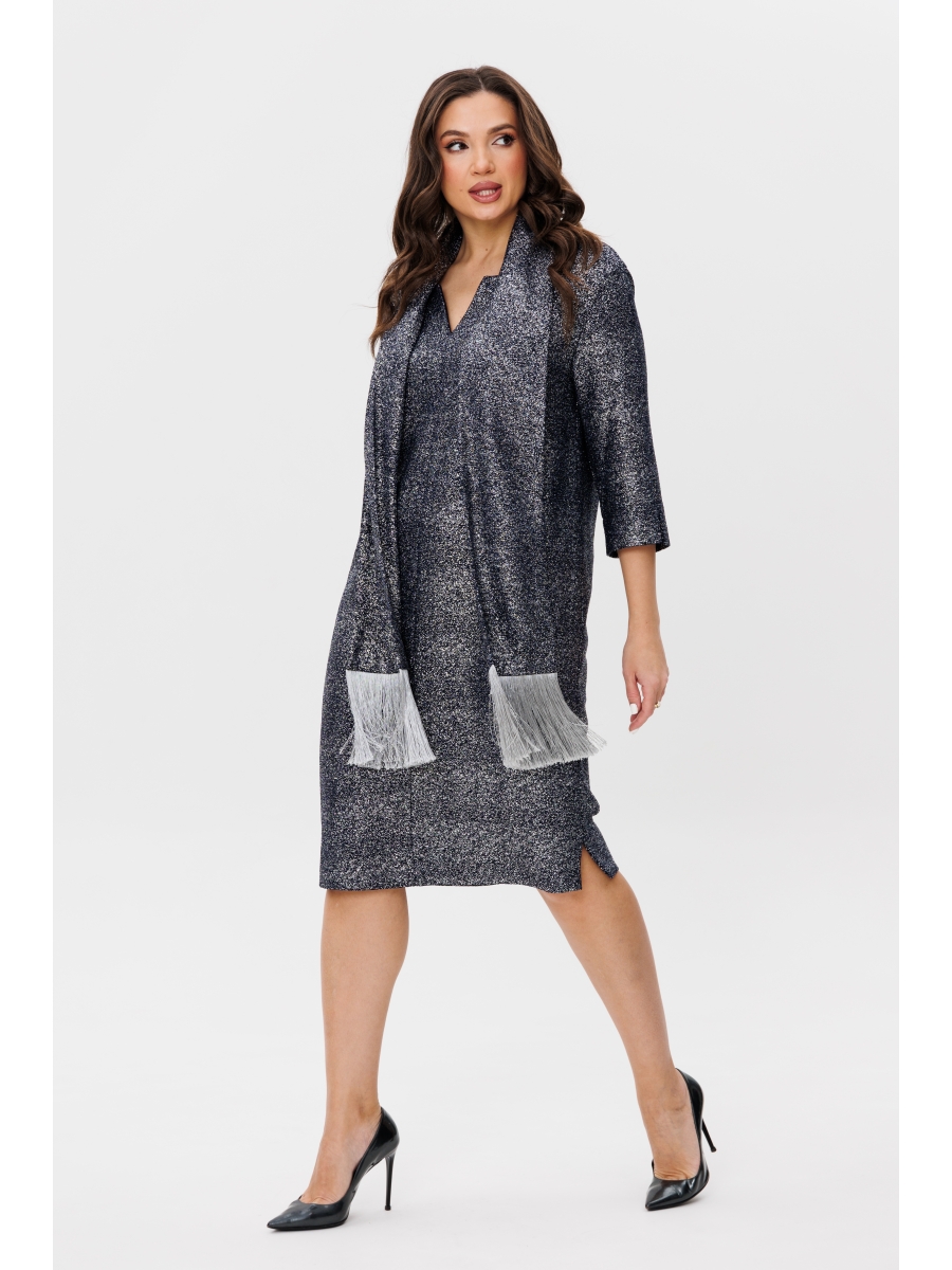 Серебренное напыление поддержанное эффектной бахромой, в лаконичном платье "шифт" длины миди, отличный выбор для праздничного настроения.