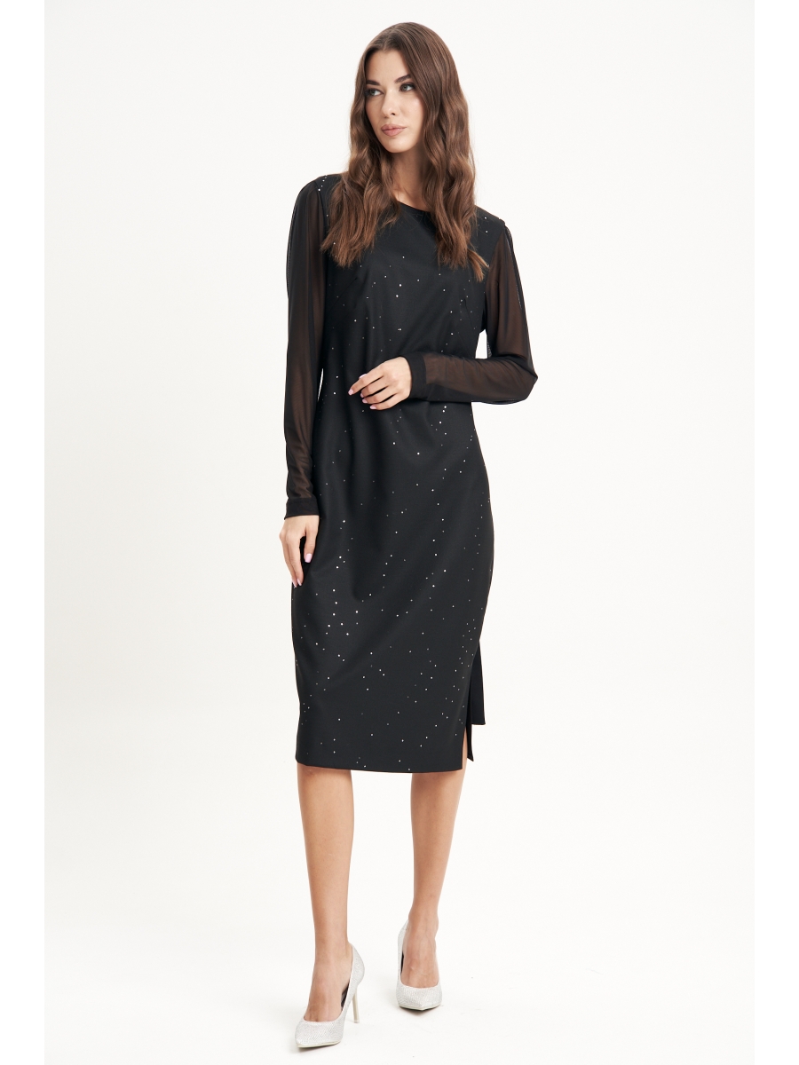 Полуприлегающий силуэт, втачной покрой, элегантный вырез-лодочка. Полочка из эффектной поливискозы с вкраплением мерцающей пайетки. Спинка из шёлкового полотна, со средним швом, застёжкой-каплей и поясом, регулирующим прилегание в области талии. Рукав из полупрозрачной трикотажной сетки.